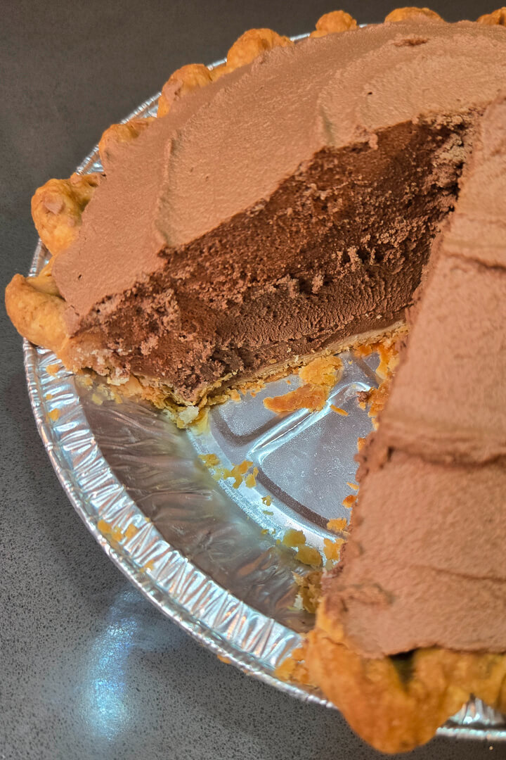 French silk pie is often topped with a layer of whipped cream, similar to chocolate cream pie. However, I find that the chocolate mousse is already light and creamy enough on its own, and an added layer of whipped cream does not necessarily improve the texture or flavor. I prefer to mound the chocolate mousse slightly above the crust and overfill the pie crust instead.