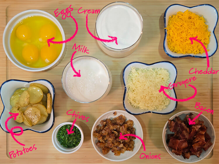 This recipe uses a mix of Gruyère, a classic cheese used in quiches, and sharp cheddar cheese, a classic topping on a loaded baked potato. I’ve provided some information on Gruyère and Cheddar below, but feel free to mix and match your favorite baked potato cheese toppings in this quiche. Just be sure to pick cheeses that are good for melting.