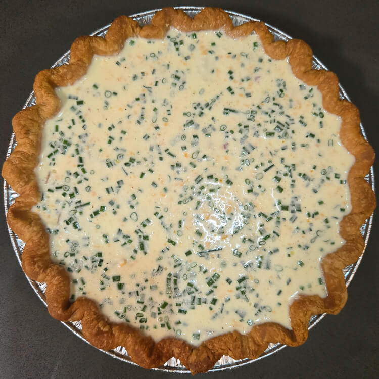 - On a metal sheet pan, pour the quiche mixture into the prepared crust, filling it just below the rim to prevent overflow.